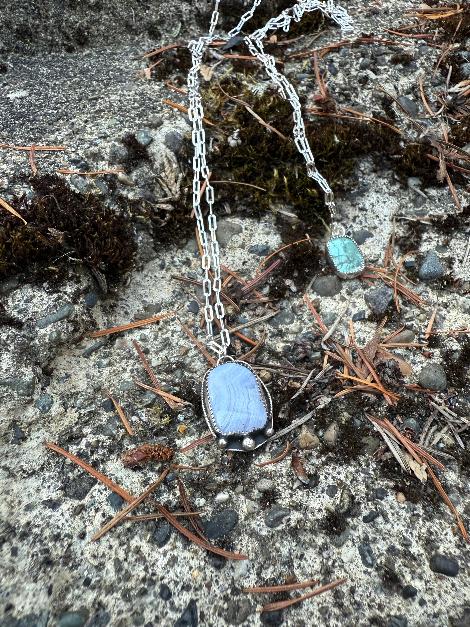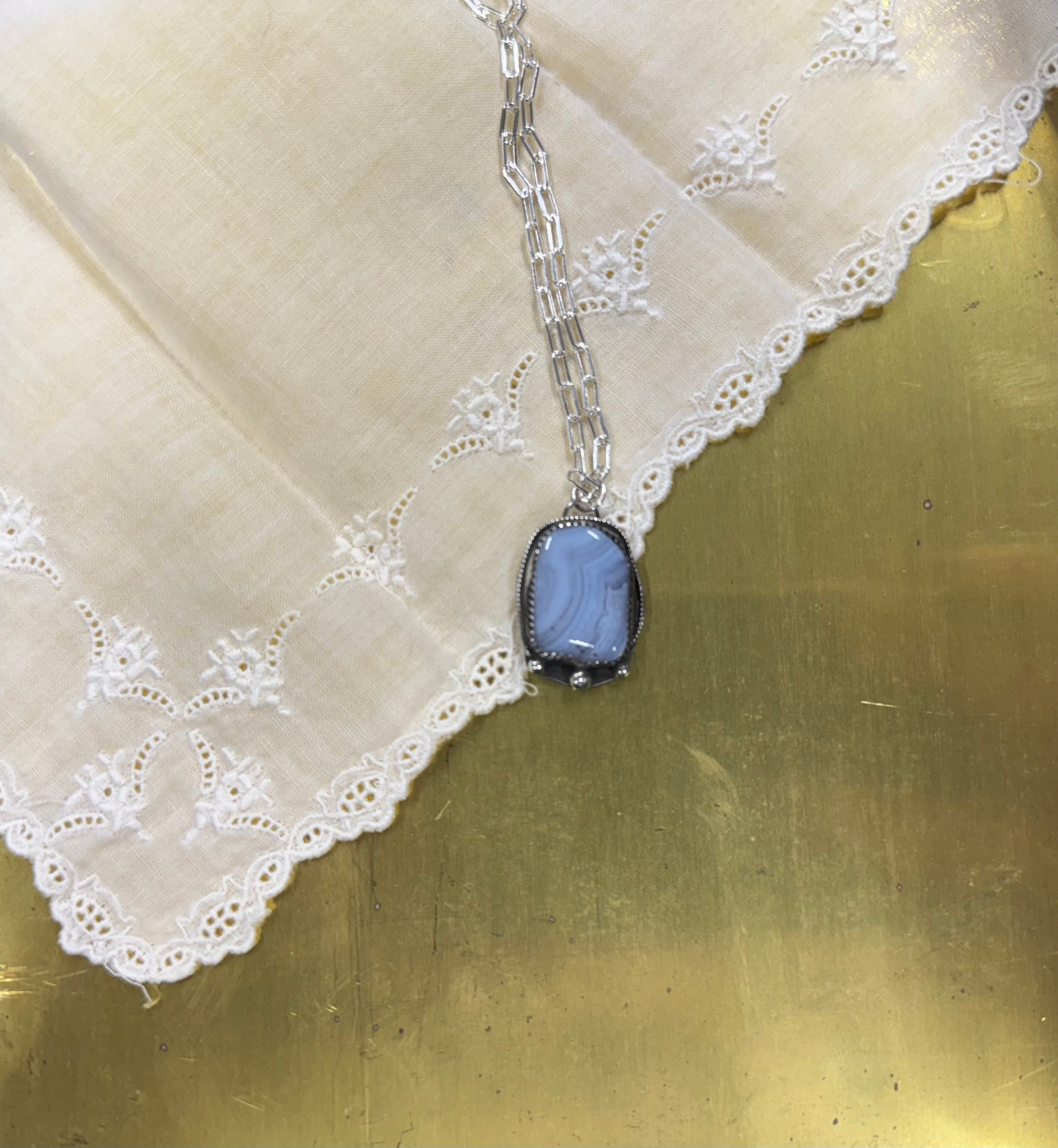 This stunning blue lace agate is set in sterling silver with extra silver balls and a rope detail. This pendant is set on a paper clip style sterling silver chain.